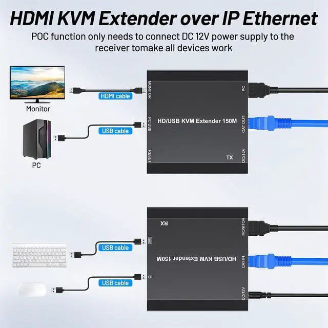 492FT (150M) HDMI USB KVM Extender Transmitter + Receiver * 1, DC 12V/1A Power Adapter * 1+USB Cable*1+User Manual * 1.