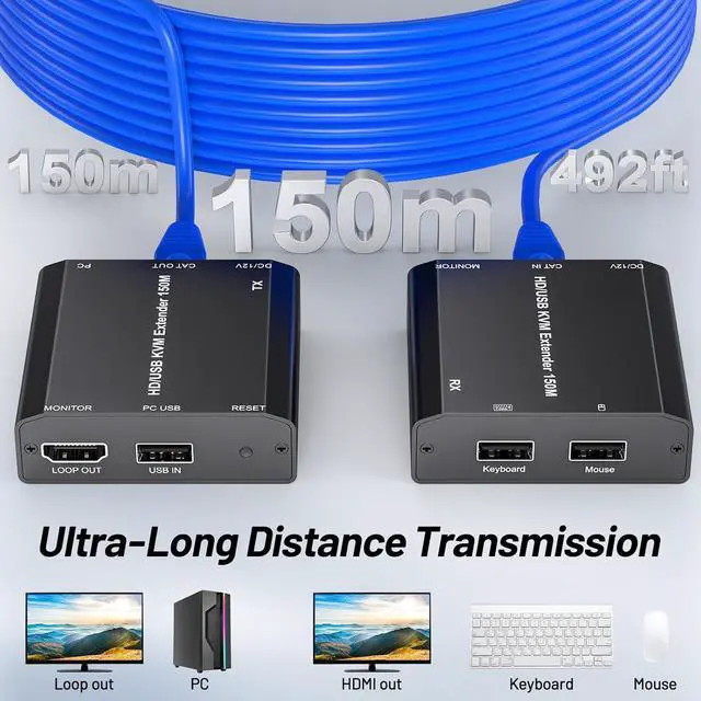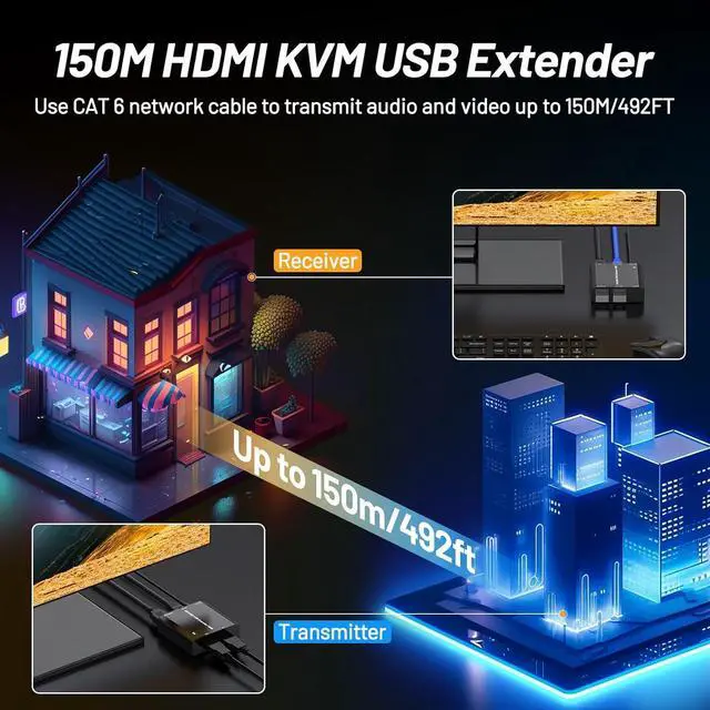 1080P@60Hz HDMI/ USB KVM extender can transmit HDMI and 2 USB signals (keyboard and mouse) up to 492ft/150m over a single CAT6 cable with zero latency, audio and video synchronization.