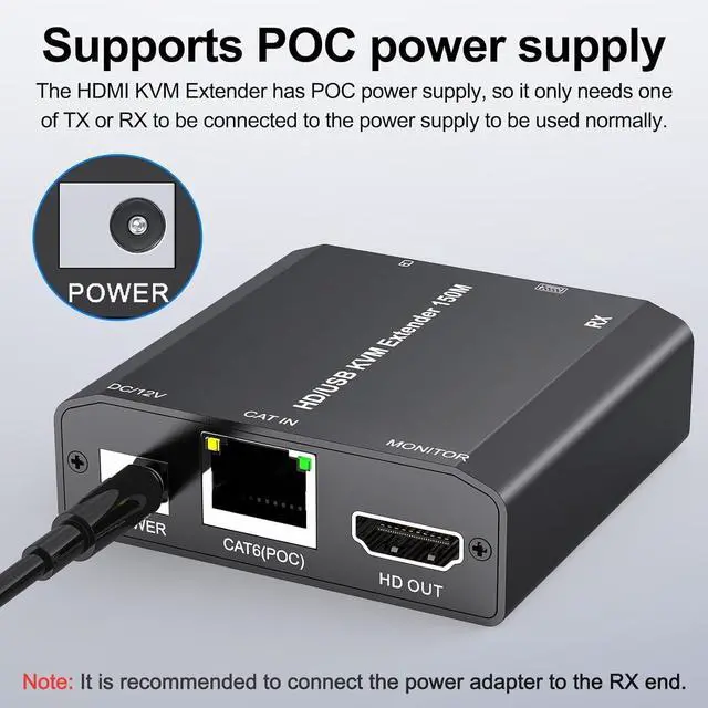 This 492ft HDMI extender adopt POC technology, power over cable, only one power adapter is needed to connect to the TX terminal can support the entire device's operation, more simple and convenient. , .It is recommended that a DC12V power adapter included in the package be connected to the power supply port on the RX side.