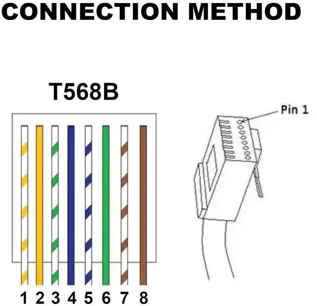 This RJ45 male to 8 pin screw terminal connector is wired in accordance with the EIA/TIA 568B wiring standard for structured cabling.