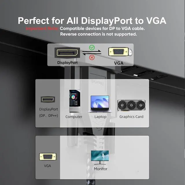 Wide CompatibilityThe display to vga cable connect desktop pc laptop to monitor hdtv projector. Compatible for Lenovo, Dell, HP, ASUS and other devices with DP port.