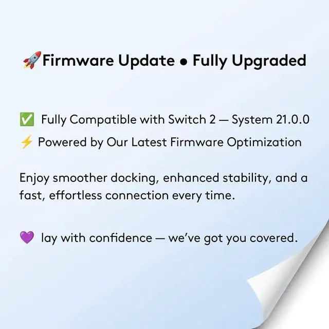 Max 100W Power Delivery Play While Charging: On-board PD chipset auto-negotiates 45W/65W/100W profiles: 45W for Switch TV mode, 65W Steam Deck, 100W ROG Ally the power youd expect from a Switch 2 TV adapter built for full-screen play. Compatible with Nintendo OEM & USB C 3.2 chargers, it ensures safe, smart fast-charging while you game. Intelligent power switching eliminates battery anxiety, letting you play and charge worry-free.