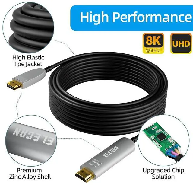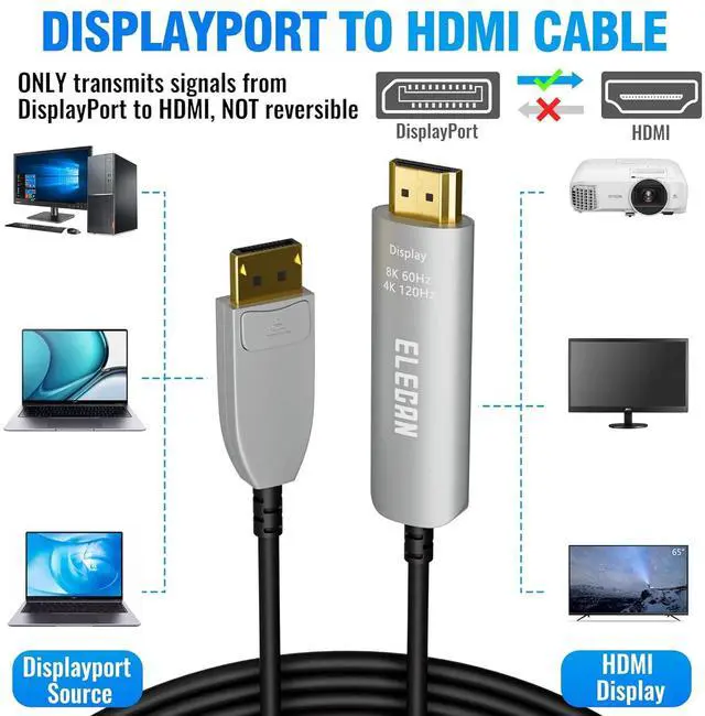 Up to 8K@60Hz: Elecan Active Optical DisplayPort to HDMI Male to Male Cable supports video resolutions up to 8K@60Hz, backward compatible with 4K@120hz 1440P@120hz, 1080P@240hz.¡¾Note¡¿: Uni-directional, only from DisplayPort host device to HDMI displays. Not for Displayport portable monitors.
