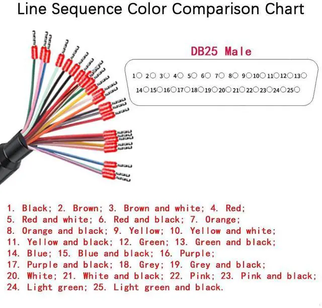 DB25 line sequence color comparison table: 1. Black; 2. Brown; 3. Brown and white; 4. Red; 5. Red and white; 6. Red and black; 7. Orange; 8. Orange and black; 9. Yellow; 10. Yellow and white; 11. Yellow and black; 12. Green; 13. Green and black; 14. Blue; 15. Blue and black; 16. Purple; 17. Purple and black; 18. Grey; 19. Grey and black; 20. White; 21. White and black; 22. Pink; 23. Pink and black; 24. Light green; 25. Light green and black.