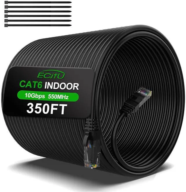 350 Feet Cat6 Ethernet Cable, Cat 6 Patch Cable, Cat6 Internet Cable, POE, UTP Network Cable, Indoor and Outdoor, 24AWG CCA, Compatible for PC, TV, Router, Switch, Server, with 25 Cable Ties - Black