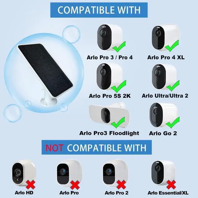 Special design This JJMASEE Solar Panel, with a magnetic charging connector, is designed for Arlo Pro 4, Arlo Pro 4 XL, Arlo Pro 5S 2K, Arlo Ultra 2, Arlo Ultra 2 XL, Arlo Pro 3 Spotlight/Floodlight, Arlo Ultra camera. (Note: Not compatible with Arlo Pro/Pro2/Arlo Essential. Camera not included.)