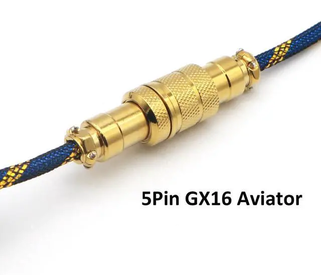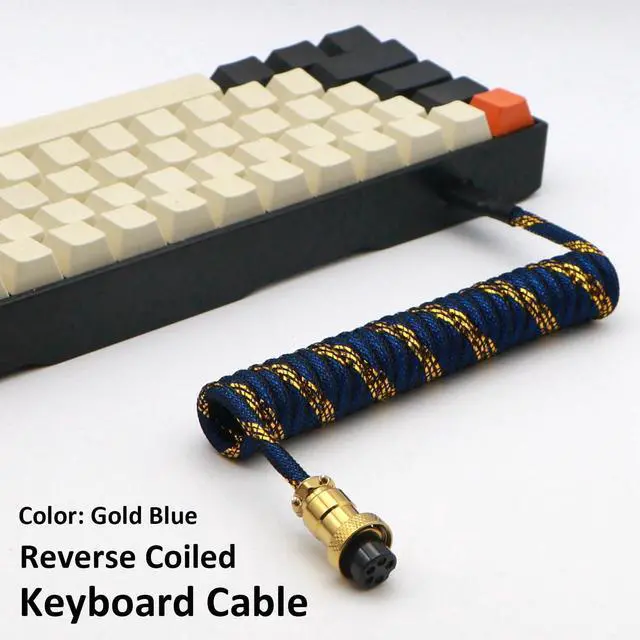Reverse Coiled Type-C Cable for Gaming Keyboard, Double-Sleeved Mechanical Keyboard Cable with Gold Metal GX16 Aviator, 1.5M USB-C to USB-A (Gold Blue)