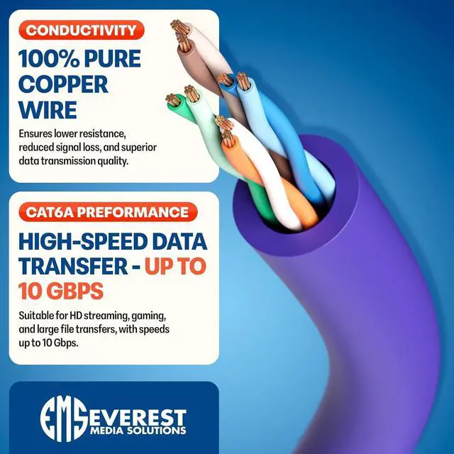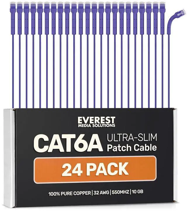 Everest Ultra Slim Cat6a Ethernet Patch Cables 10ft (24-Pack) Purple - 10GB Cat 6a Patch Cable - Bendable, Flexible & Thin Ethernet Cable - Space Saving 32AWG 550MHZ Cat6a Cables - 100% Copper Wires