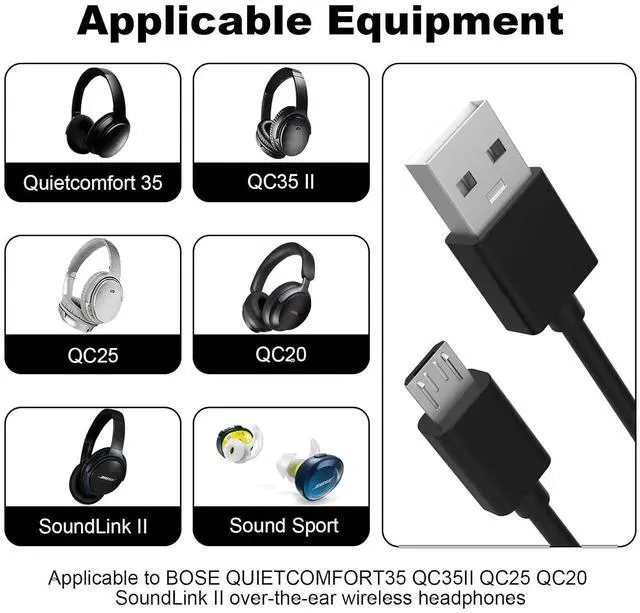 CompatibilityThis charging cable is compatible with Bose QC35, QC35 II, QC25, Soundlink II, Over-Ear headphone and more
