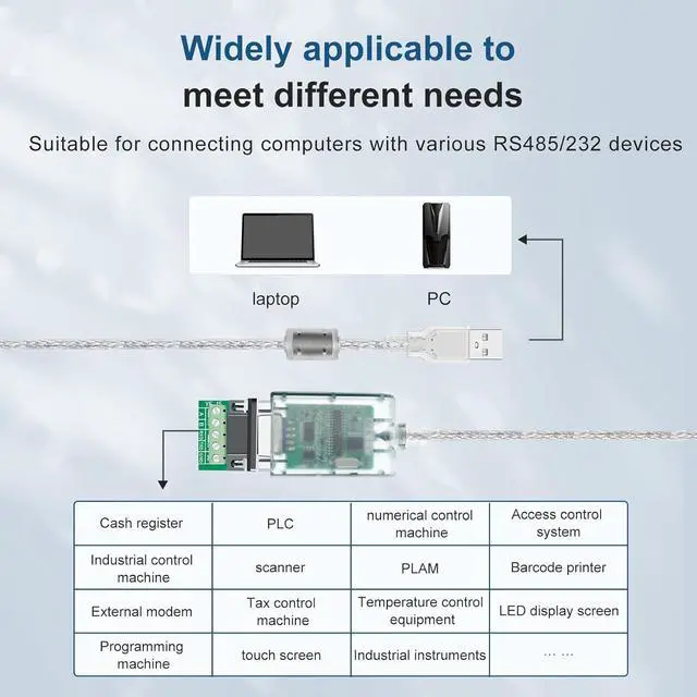 **Wide System Compatibility**: This industrial-grade USB to RS232 converter is compatible with a variety of operating systems including WINDOWS98/CE/2000/2003/2008/XP/VISTA7/8/10, LINUX, and MACOSX. The USB interface is hot-swappable, making it widely applicable in PLCs, printers, POS systems, and industrial control equipment.