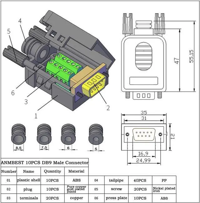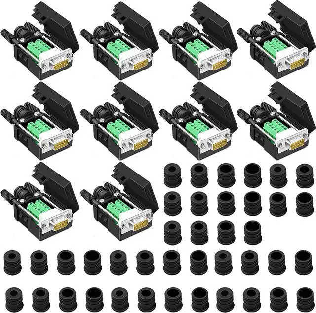 10PCS DB9 Male Breakout Connector,DB9 Solderless RS232 D-SUB Serial to 9-pin Port Terminal Adapter Connector Breakout Board with Case Long Bolts Tail Pipe