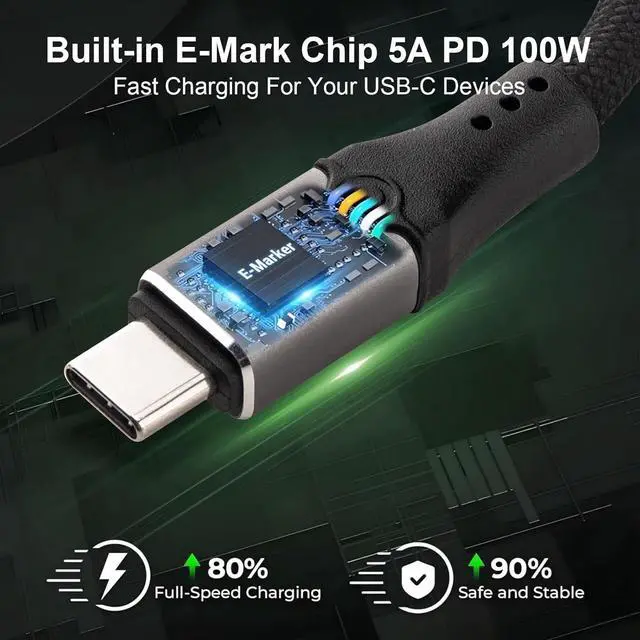 Data transfer speed to the next level: Most USB 4 cables on the market stop at 40Gbps, while our USB C high-speed data transfer cable directly doubles the speed to a staggering 80Gbps. For users who often need to transfer large files, the waiting time will be drastically shortened. For example, transferring a 100GB 4K movie from 40Gbps in about 2.5 minutes to 80Gbps in about 1.25 minutes, doubling the efficiency.