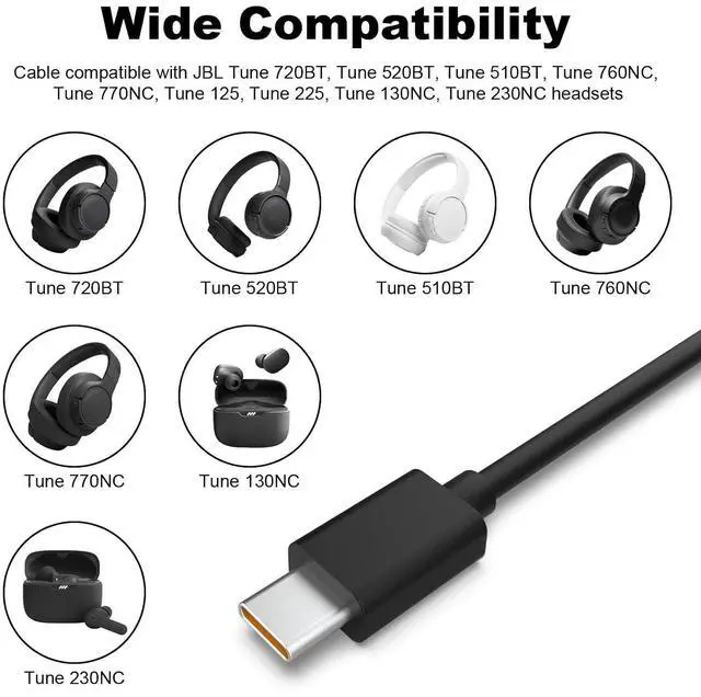 Compatible With: This Type c charging cable is compatible with JBL Tune 720BT, Tune 520BT, Tune 510BT, Tune 760NC, Tune 770NC, Tune 125, Tune 225, Tune 130NC, Tune 230NC headphones and headphone compartment charging