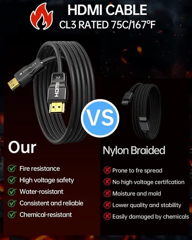 In-Wall CL3 Certified Fiber Optic HDMI 2.1 Cable Safe, Seamless, and Built for Clean SetupsDesigned for professional in-wall installations, this 50ft CL3-rated HDMI 2.1 fiber optic cable meets strict safety standards, making it perfect for home theaters, gaming rooms, and office setups. Its fire-resistant design ensures compliance with building codes while delivering crystal-clear 8K@60Hz or 4K@120Hz performance through walls. A top choice for seamless, high-end AV integration.