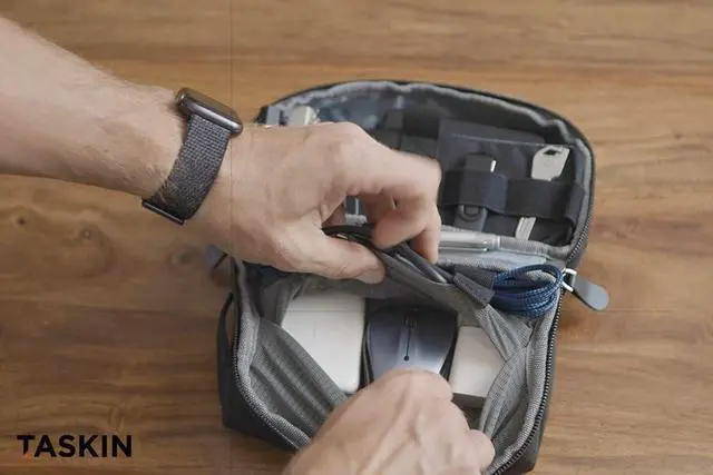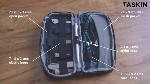 Original Design: Taskin Electronics Organizer's original 180° stay-open design is meant to optimize storage and accessibility. One of its key features is the rigid stay-vertical mid section. Both sides provide options to store items of various shapes and sizes. The design also makes it easy to find what you need when you need it without having to fumble around.