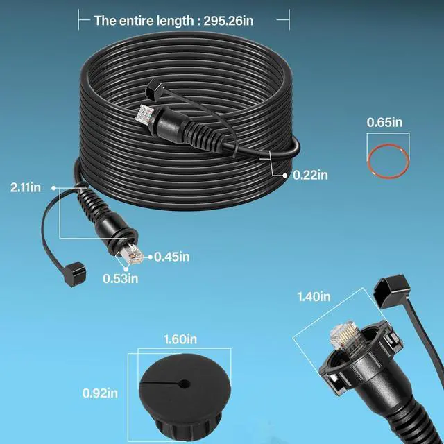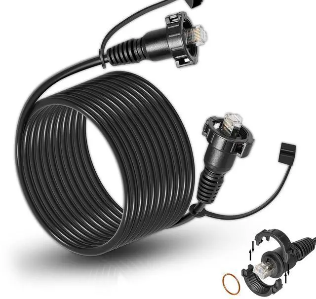 Practical Design1) Two-pieces threaded locking nuts on both connectors: make the connection more robust and also seals better compared with an ordinary cat5 cable; 2)Orange O-rings: provide watertight protection; 3)black rubber ends: prevents connector being damaged or exposed in water/rain when not connected with the units.