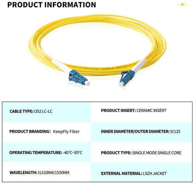 High-quality OS2 LC to LC Single Mode Simplex Fiber Patch Cable:Made with the finest materials and craftsmanship,our fiber optic cable ensures seamless data transmission and reliable performance.With low insertion loss (<0.3dB) and high return loss (>50dB),it guarantees exceptional signal quality for your network.