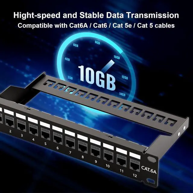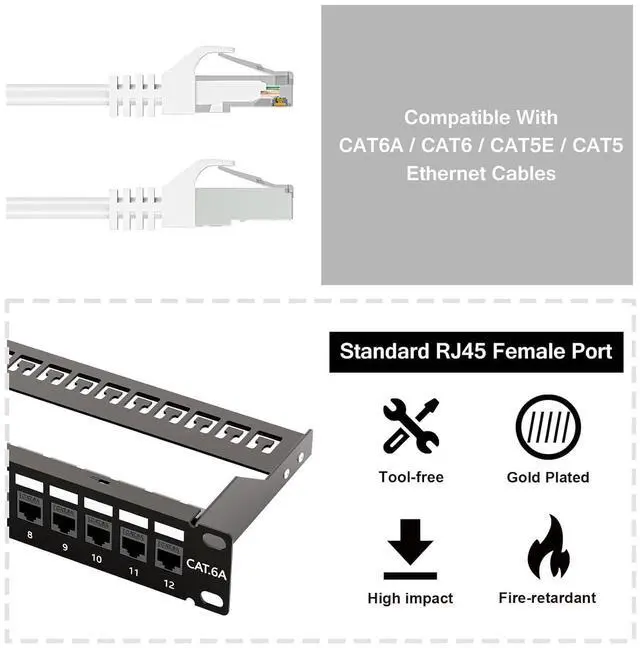 Gold Plated Keystone: Gold-plated contacts ensure corrosion-free connections and improve connector durability. This 12 port patch panel up to 10 Gigabit Ethernet applicationsCable length can up to 100m). Bandwidth 500MHZ