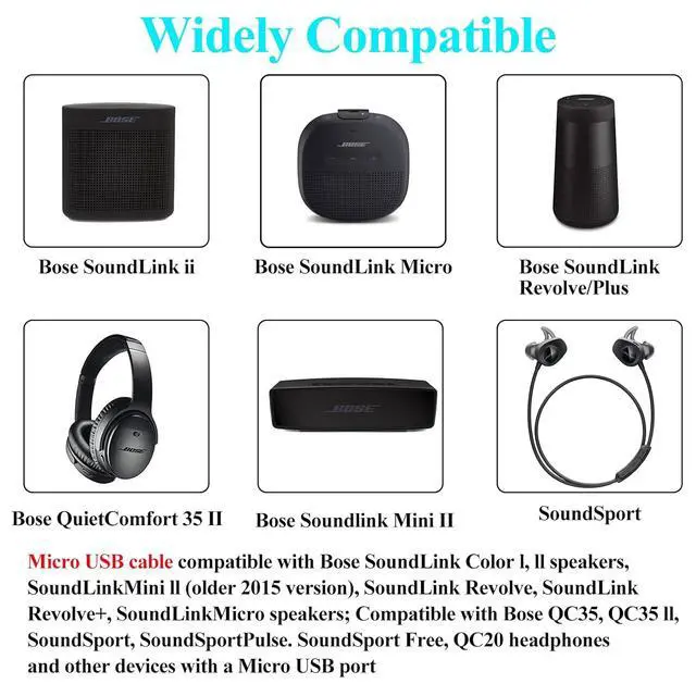 Compatible Devices: The USB Micro charging cable is compatible with Bose QuietComfort 35,Bose SoundLink Color, Bose SoundLink Color 2 (II), Bose SoundLink Mini 2 (II), Bose SoundLink Revolve, Bose SoundLink Revolve+ (Plus), Bose SoundLink Micro, Bose SoundSport, Bose QuietComfort 35, Bose QuietComfort 35 Series II / 2, Bose QuietComfort 20, Bose QuietComfort 20I, Bose AE2W, and any other devices with Micro USB port .