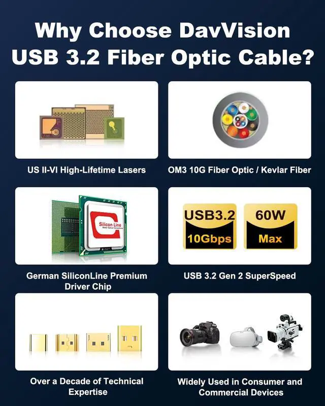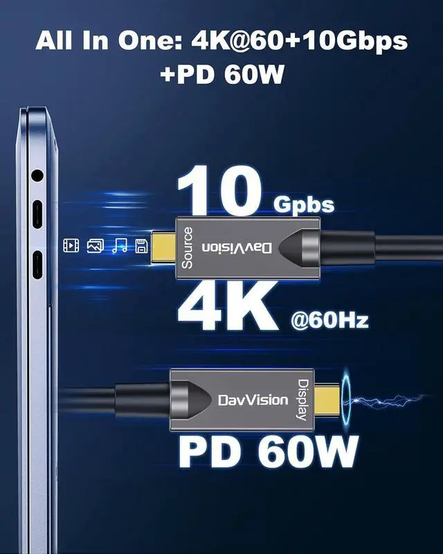 All-in-One Fiber USB C: DavVision full featured usb 3.2 gen2 cable support 60W power delivery for seamless productivity. Enjoy fast 10Gbps data transfer and built in 2-lane DP 1.4 for 4K@30Hz video output,fiber transmission for zero data loss & zero EMI.