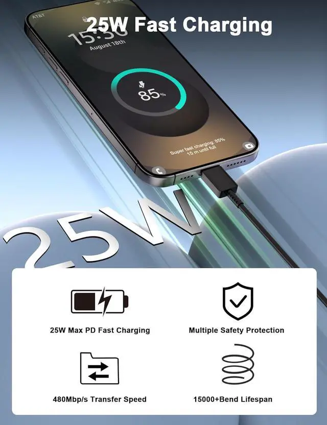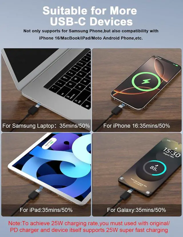 Wide Compatibility:this galaxy charging cord compatible with all devices with a USB-C connector,fit for Samsung Galaxy S25,S25+,S25 Ultra,S24,S24 ultra,S24 FE,S23 S22 S21,S20 series;Galaxy Z Fold 7 6 5 Flip7 6 5;Galaxy A17 A16 5G A25 A26 A36 A56 A15 A25 A21 A35 A55 A54 A51 A14 A13 A12 A71 A42 A03s A02s,Galaxy S10,S10+,S10e,S9,S9+,S8,Note 20 Note10 9 8,for iPhone 16e 16 Pro Max 15 plus,for iPad Pro iPad Air 10th A16;and other models usb-c phone or tablets device