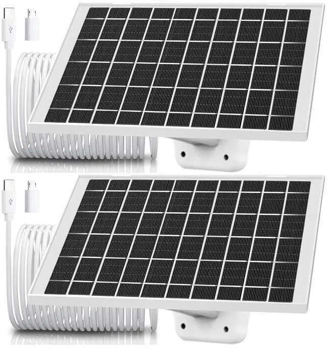 Packages Include2x Solar Panel, 2X 3m(9.8ft) Micro USB & USB -C Cable, 2 X 360-Degree Mounting Bracket, 2 pack Circle cable clips with steel nail