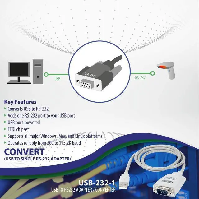 High-quality, high-performance USB to RS232 adapter FTDI chipset Supports ALL major Windows, Mac, and Linux 300 to 128K Baud operation (auto-sensing and self-adjusting) No IRQs required, no IRQ conflicts