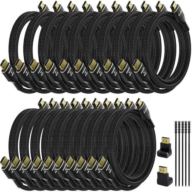 HDMI Cables with Kit: Friendly design of our 4K HDMI cables include: 20 pack high quality HDMI cables, 2 extra right angle HDMI adapters (1 x 270 degree and 1 x 90 degree), 25 cable ties(black). These free accessories can bring great convenience in your use.