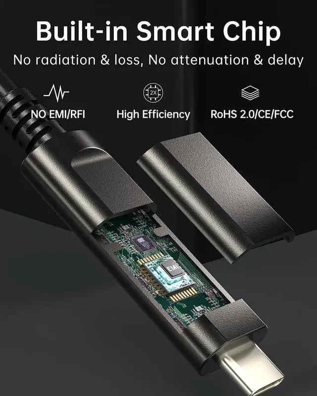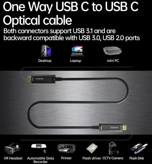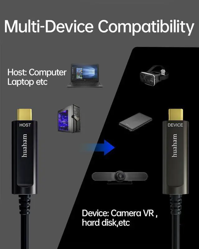 10Gbps Fiber Optic USB 3.2 Cablehuaham type c fiber optic cable adopts advanced photoelectric conversion technology and a built-in German SiliconLine optical conversion chip to achieve 10Gbps bandwidth long distance transmission, ensuring zero delay, zero data loss and electromagnetic interference. Fiber optic is softer, faster, lighter, and has better EMI/EMC (anti-electromagnetic interference) technology.