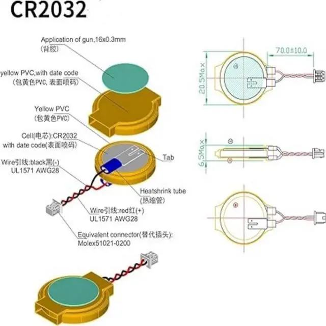 Voltage: 3V; Capacity: 240mAh; Diameter: 20.5mm, Height: 6.5mm. Connector: CR2032-MX51021.