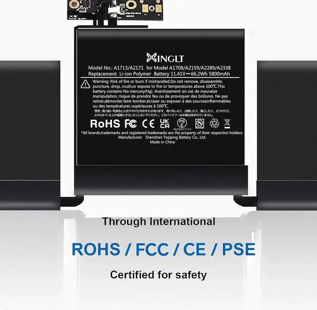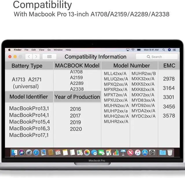 Battery Model No.:A1713/A2171Battery Details:Voltage: 11.41V. Capacity: 66.18Wh / 5800mAhBattery TypeLithium polymer batteryCompatible:For 13-Inch Macbook Pro A1708 (2016/ 2017), A2159 (2019), A2289(2020), A2338 (2020).Model Identifier:For MacBookPro13,1/MacBookPro14,1/MacBookPro15,4/MacBookPro16,3/MacBookPro17,12016 Model Identifier:For MacBookPro13,1 (MacBook Pro (13-inch, 2016, Two Thunderbolt 3 ports)) Part Numbers: MLL42xx/A, MLUQ2xx/A2017 Model Identifier:For MacBookPro14,1(MacBook Pro (13-inch, 2017, Two Thunderbolt 3 ports)) Part Numbers: MPXQ2xx/A, MPXR2xx/A, MPXT2xx/A, MPXU2xx/A2019 Model Identifier:For MacBookPro15,4(MacBook Pro (13-inch, 2019, Two Thunderbolt 3 ports)) Part Numbers: MUHN2xx/A, MUHP2xx/a, MUHQ2xx/A, MUHR2xx/A, MUHR2xx/B2020 Model Identifier:For MacBookPro16,3(MacBook Pro (13-inch, 2020, Two Thunderbolt 3 ports)) Part Numbers: MXK32xx/A, MXK52xx/A, MXK62xx/A, MXK72xx/A2020 Model Identifier:For MacBookPro17,1 (MacBook Pro (13-inch, M1, 2020)) Part Numbers: MYD83xx/A, MYD92xx/A, MYDA2xx/A, MYDC2xx/AEMC2978/3164/3301/3456/3578 A1708 battery with intelligent core temperature control,full real-time temperature control ,won't get hot and hurt the machine