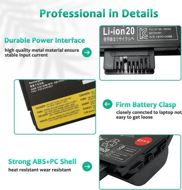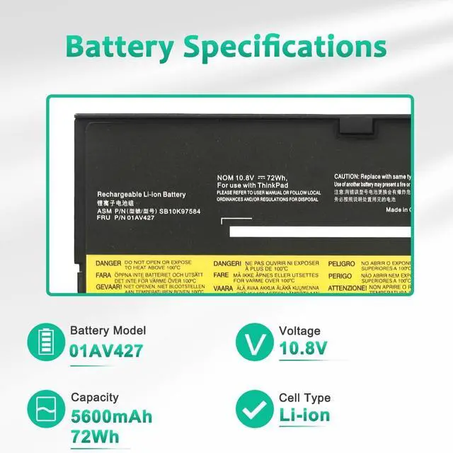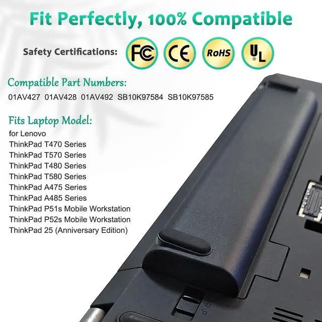 Compatible with:Lenovo ThinkPad T470 SeriesCompatible with:Lenovo ThinkPad T480 SeriesCompatible with:Lenovo ThinkPad T570 SeriesCompatible with:enovo ThinkPad T580 SeriesCompatible with:Lenovo ThinkPad A475 SeriesCompatible with:Lenovo ThinkPad A485 SeriesCompatible with:Lenovo ThinkPad P51S SeriesCompatible with:Lenovo ThinkPad P52S SeriesCompatible with:Lenovo ThinkPad TP25 (Anniversary Edition 25) SeriesCOMPATIBILITY BATTERY MODEL :61++ 01AV427 01AV428 01AV492 4X50M08812 SB10K97584 SB10K97585 NOTE: