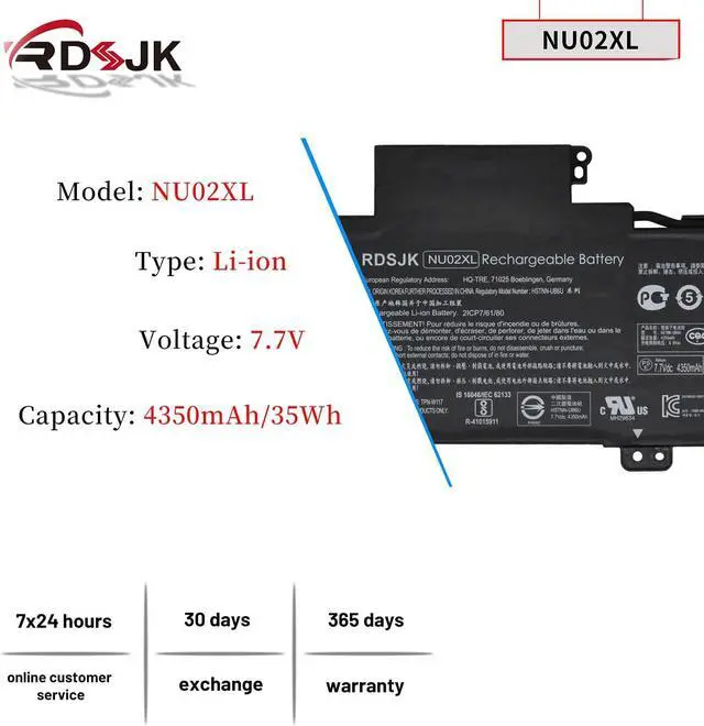 NU02XL NU02035XL HSTNN-UB6U 843535-541 844200-850 HSTNN-UB6V TPN-W117 NUO2XL