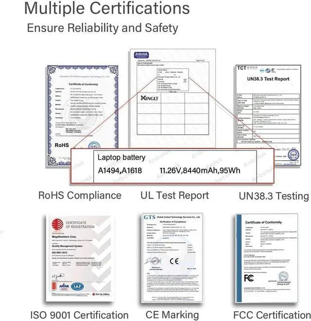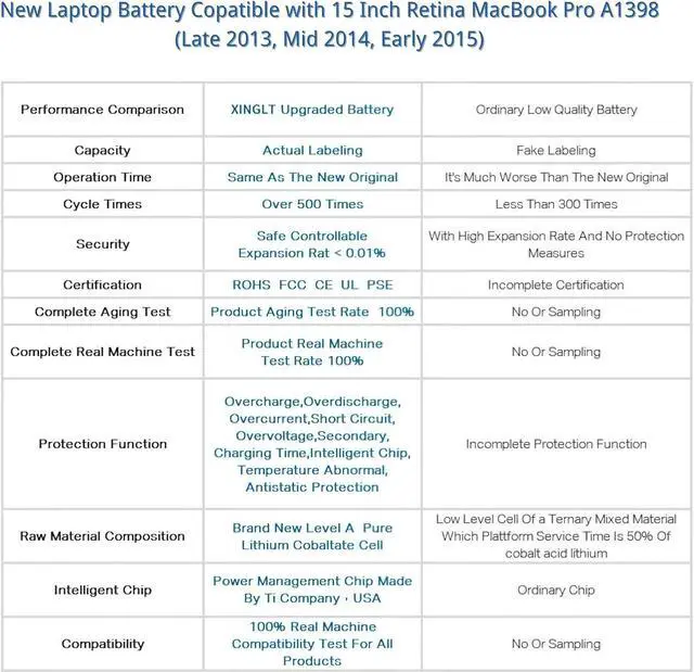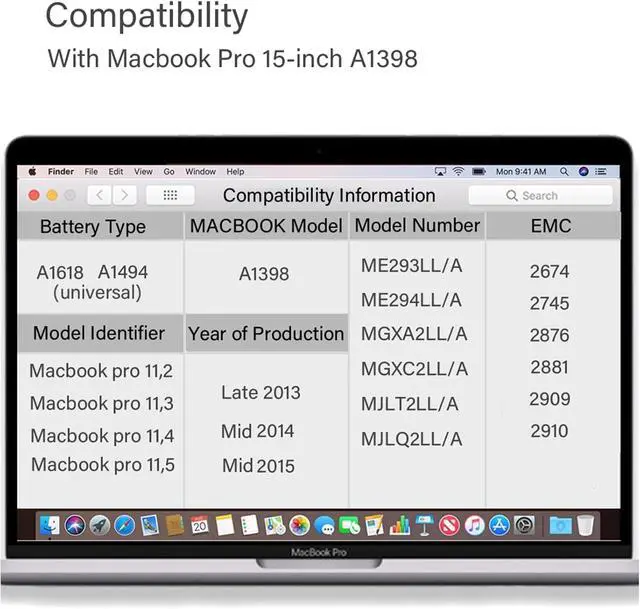 Battery Model No.:A1494/A1618Battery Details:Voltage:11.26V. Capacity: 95Wh /8440mAhBattery TypeLithium polymer batteryFits for the year of MacbookFits foc(Late 2013, Mid 2014, Mid 2015) MacBook Pro 15'' Retina A1398 Model IdentifierFor MacBookPro11,2 /MacBookPro11,3 /MacbookPro11,4/MacbookPro11,5Late 2013 Model Identifier For MacBookPro11,2, MacBookPro11,3(MacBook Pro (Retina, 15-inch, Late 2013))Part Number: ME293xx/A, ME294xx/A (Newest compatible operating system: macOS Big Sur)Mid 2014 Model IdentifierFor MacBookPro11,2, MacBookPro11,3(MacBook Pro (Retina, 15-inch, Mid 2014))Part Number: MGXC2xx/A, MGXA2xx/A(Newest compatible operating system: macOS Big Sur)Mid 2015 Model IdentifierFor MacBookPro11,4, MacBookPro11,5(MacBook Pro (Retina, 15-inch, Mid 2015))Part Number: MJLQ2xx/A, MJLT2xx/A, MJLU2xx/A (Newest compatible operating system: macOS Monterey)EMC2674/2745/2876/2881/2909/2910AttentionPlease be noted this A1398 Battery can not be fitted with Mid 2012 Early 2013 Macbook pro 15 A1398 Retina Series The XINGLT Replacement Battery for MacBook Pro A1398 features high-quality cells, ensuring stable performance and reliable battery life. Whether for daily tasks or intensive workloads, it provides long-lasting power.