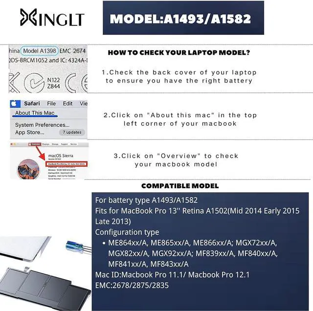 Battery Model No.:A1493/A1582Battery Details:Voltage:11.34V.;Capacity: 79.38Wh / 7000mAhBattery TypeLithium polymer batteryFits for year of Macbook ProFits for (Late 2013/ Mid 2014/ Early 2015) MacBook Pro 13 inch Retina A1502 Model Identifier:For MacBookPro11,1/ MacBookPro12,1Late 2013 Model Identifier:For MacBookPro11,1 (MacBook Pro (Retina, 13-inch, Late 2013) )Part Numbers: ME864xx/A, ME865xx/A, ME866xx/A (Newest compatible operating system: macOS Big Sur)Mid 2014 Model Identifier:For MacBookPro11,1(MacBook Pro (Retina, 13-inch, Mid 2014)) Part Numbers: MGX72xx/A, MGX82xx/A, MGX92xx/A(Newest compatible operating system: macOS Big Sur)Early 2015 Model Identifier:For MacBookPro12,1(MacBook Pro (Retina, 13-inch, Early 2015)) Part Numbers: MF839xx/A, MF840xx/A, MF841xx/A, MF843xx/A (Newest compatible operating system: macOS Monterey)EMC2678/2875/2835 Resetting the System Management Controller (SMC) resolves certain issues related to power, battery, and other functions.The SMC is responsible for managing the behavior associated with the following functions. If you are experiencing problems related to these functions, you may need to reset the SMC. -Power, including the power button and the USB port for power, battery, charging, fan, and other thermal management functions. -Indicators or sensors, such as status indicators (sleep status, battery charge status, etc.), burst motion sensors, ambient light sensors and keyboard backlighting, and behavior when opening and closing the laptop lid.