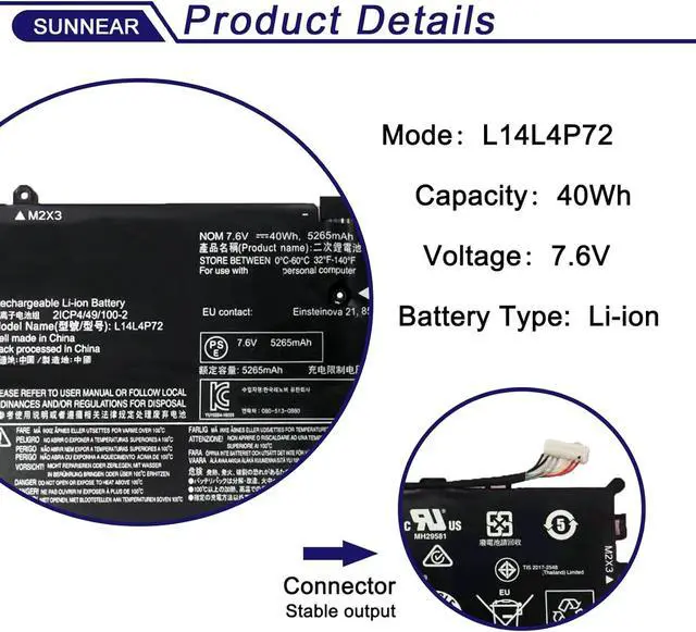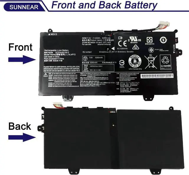 SpecificationsModel: L14L4P72 Voltage: 7.6V Capacity: 40Wh/5265mAh Battery type: Li-ion. Battery life: Up to 501 recharge cycles over the life of the battery. Also comes with installation tools