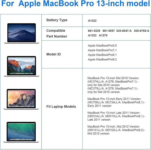 Compatible Part NumberFor MacBook Pro 13 inch A1322 A1278 made in 2009 2010 2011 2012, NOT for laptops made in 2008.