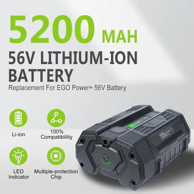 Brand New 5.2Ah Spare Battery for EGO : Replacement for EGO 56V Battery | Voltage: 56 Volt | Lithium-Ion | Capacity: 5200mAh | the EGO replacement battery can downtime and give you longer lasting time. it is a good option as a spare battery for your EGO 56V Power Tools