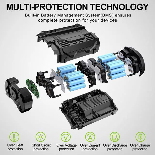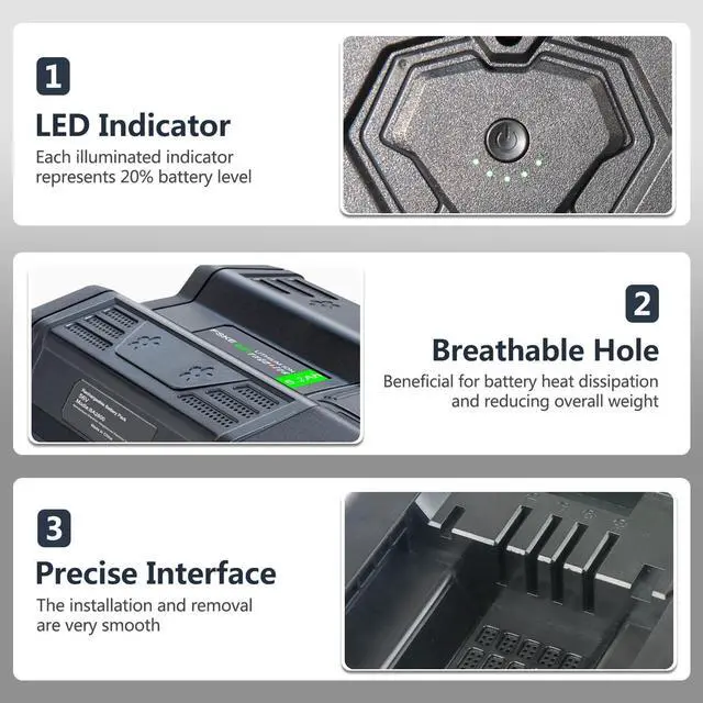 Humanized Design -- Made in high quality battery cells integrated microchip protects the rechargeable battery replacement for ego battery 56v 5.0 ah and extends lifetime, equipped with automatic overload cut-off, short-circuit and over-voltage protection, no memory effect, can be charged or discharged as needed without capacity reduction, the chargeable battery easy meet your outdoor requirement