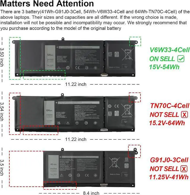 Compatible Part NumberV6W33 TN70C G91J0 0WV3K8 0VKYJX 0MVK11 0XDY9K PG8YJ 0PG8YJ 927N5 0927N5 FH3K2 0FH3K2 MGCM5 0MGCM5 JGCCT N9XX1Compatible ModelReplacement for Dell Inspiron 13 5310 5320 5330 Series;Compatible ModelReplacement for Dell Inspiron 14 5410 5415 5418 5420 5425 5430 5435 5440 5445 Series;Compatible ModelReplacement for Dell Inspiron 14 Plus 7420 7430 7440 Series;Compatible ModelReplacement for Dell Inspiron 14 5410 7415 7420 7425 7430 7435 7440 7445 2-in-1 Series;Compatible ModelReplacement for Dell Inspiron 15 3510 3511 3515 3520 3521 3525 3530 3535 Series;Compatible ModelReplacement for Dell Inspiron 15 5510 5515 5518 Series;Compatible ModelReplacement for Dell Inspiron 15 5515 (R1508STW / R1608STW / R1708STW) Series;Compatible ModelReplacement for Dell Inspiron 16 5625 5630 5635 5640 5645 Series;Compatible ModelReplacement for Dell Latitude 3320 3330 3420 3430 3520 3530 Series;Compatible ModelReplacement for Dell Latitude 3445 5430 Chromebook Series;Compatible ModelReplacement for Dell Vostro 13 5310 5320 Series;Compatible ModelReplacement for Dell Vostro 14 3420 3425 3430 3435 5410 5415 Series;Compatible ModelReplacement for Dell Vostro 15 3510 3511 3515 3520 3525 3530 3535 3562 5510 5515 Series;Compatible ModelReplacement for Dell Vostro 16 5620 5625 5630 5635 5640 Series.NOTEThere are 3 batteries (41Wh-G91J0 , 54Wh-V6W33 and 64Wh-TN70C ) of the above laptops, Please choose which one you are going to replace according to your laptop's original battery.Matters needing attention If you install the battery, you find that the laptop cannot detect the battery or the battery level cannot be displayed normally. Please check whether the battery cable is installed properly. Sometimes the battery cannot be charged because the cable is not fixed properly.Matters needing attentionNot all the compatible laptop models have been listed.Please open the back cover of your laptop to check the original battery size and capacity before placing an order. What do I need to be aware of when I receive a battery?