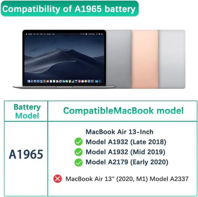 GUARANTEED FIT THESE LAPTOP MODELS: Compatible with MacBook Air Retina 13-inch (Late 2018) Model A1932 , MacBook Air Retina 13-inch (Late 2019) Model A1932, MacBook Air Retina 13-inch (Early 2020) Model A2179, Model ID: MacBookAir8,1 & MacBookAir8,2 & MacBookAir9,1.