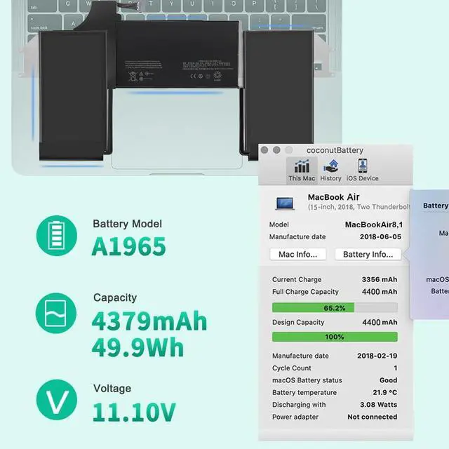 LONG-LASTING BATTERY LIFE: With 11.4V capacity ( 49.9Wh/4379mAh ), the ( A1965) battery ensures all-day power for your laptops in a factory-fresh, never-used battery pack designed for maximum performance.