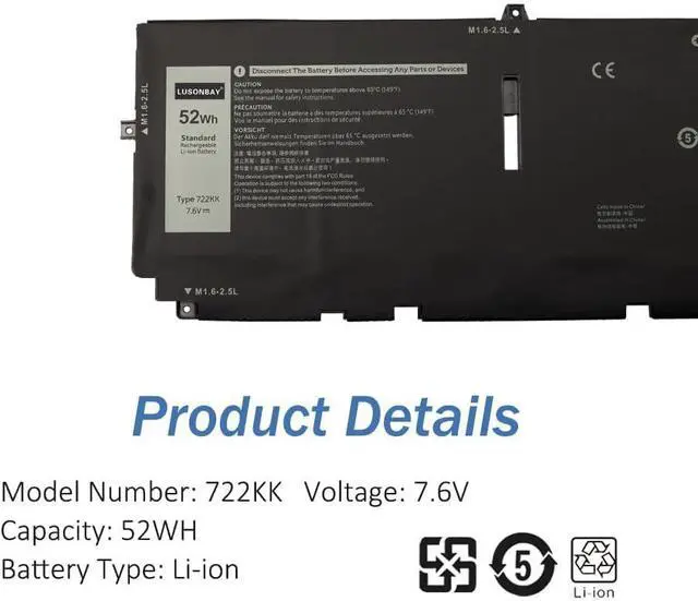 Specifications722KK battery for laptop/notebook, laptop battery specifications Voltage: 7.6V, Capacity: 52Wh, Battery Type: Li-ion, Condition:100% Brand New, Cell: Grade "A++" Cell. Each battery will undergo multiple strict test processes before shipping, we strive to bring the highest quality battery to each customer, give your laptop a new lease of life.