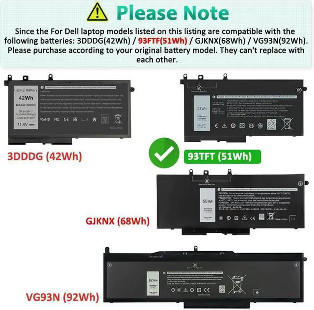 The Dell laptop models on this product page are compatible with 4 battery models: [93FTF 51Wh 3-Cell], [GJKNX 68Wh 4-Cell], [VG93N 92Wh 6-Cell], [3DDDG 42wh 3-Cell].