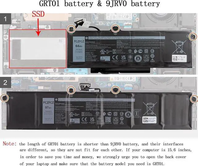 Replacement for Part NumberGRT01 00P3TJ 0P3TJ 0R05P0 R05P0 05RGW (NOTE: the length of GRT01 battery is shorter than 9JRV0 battery, and their interfaces are different, so they are not fit for each other. If your computer is 15.6 inches, in order to save you time and money, we strongly urge you to open the back cover of your laptop and make sure that the battery model you need is GRT01.)
