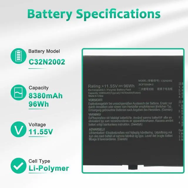 LONG-LASTING BATTERY LIFE- With 11.55V capacity ( 96Wh/8380mAh ), the ( C32N2002 ) battery ensures all-day power for your laptops in a factory-fresh, never-used battery pack designed for maximum performance.