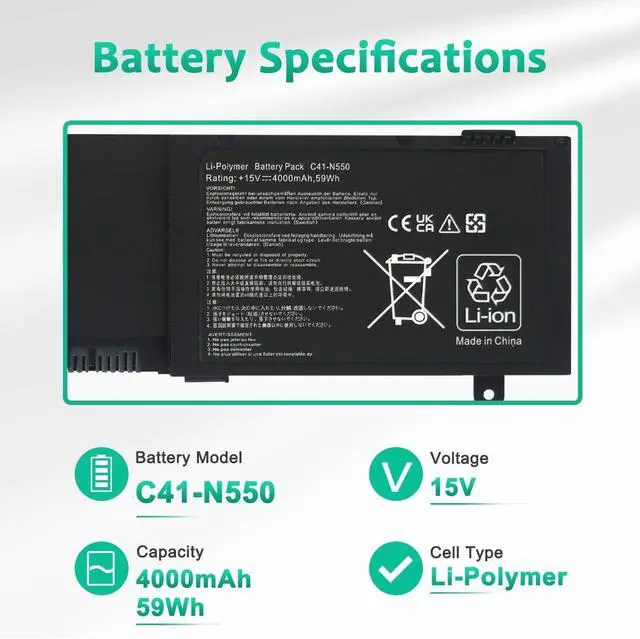 LONG-LASTING BATTERY LIFE: With 14.8V,,capacity (59Wh/4000mAh),the(C41-N550) battery ensures all-day power for your laptops in a factory-fresh, never-used battery pack designed for maximum performance.
