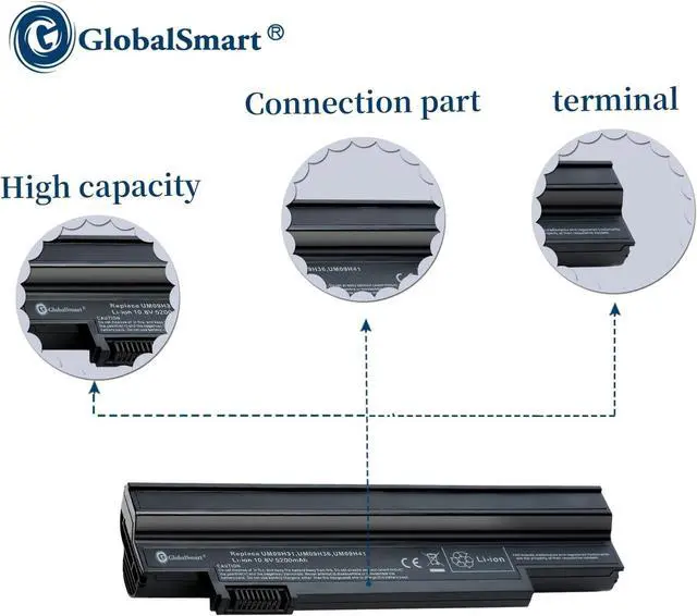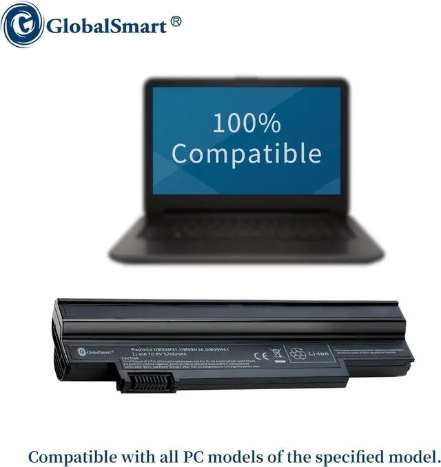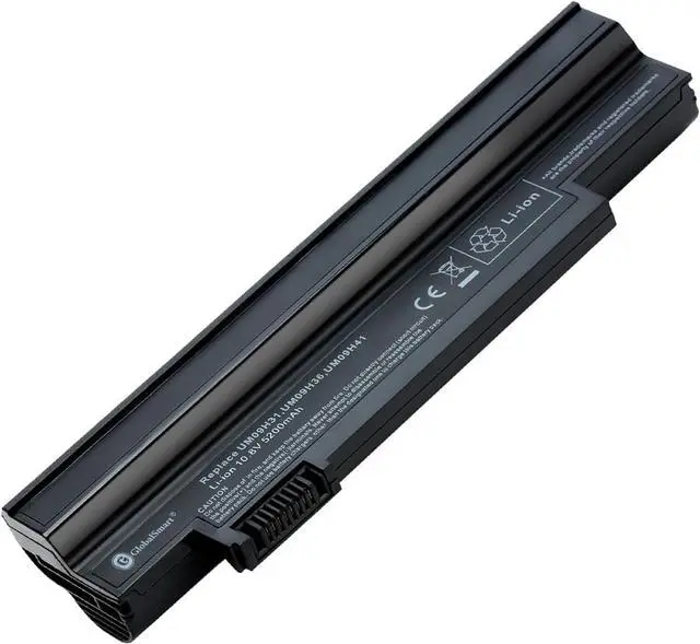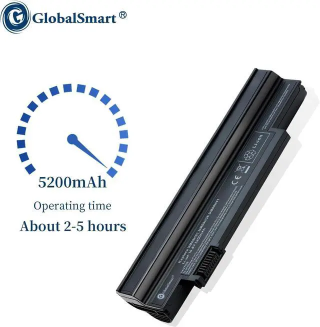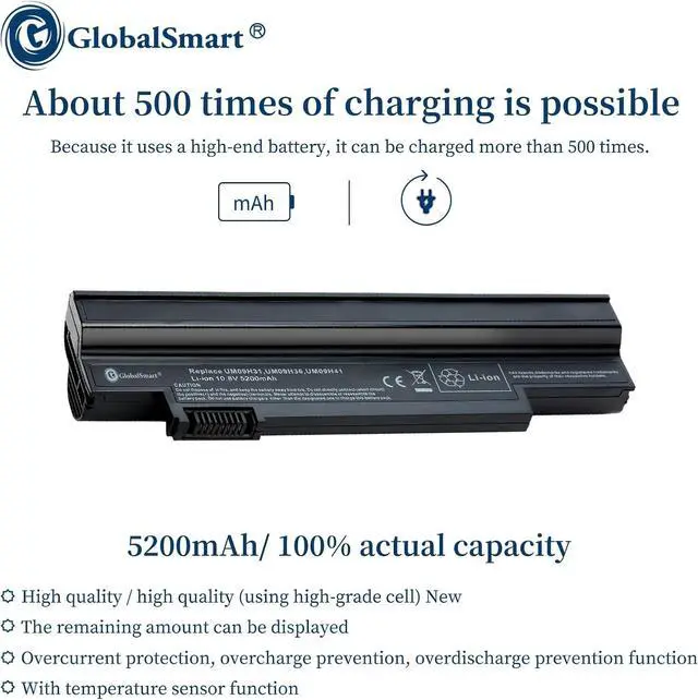 Fit BrandAcerCells QTY06CellVoltage (V)10.8VCapacity5200mAh ColorBlackWeight304 gDimension size20.5*5.5*3.2cmBattery typeLi-ion Lithium-ion batteryModel number(battery code) UM09G31/ UM09H31/ UM09H51/ UM09H73/ UM09G71/ UM-2009G/ UM09C31/ UM09H70/ NAV50 UM09G41/ UM09H36/ UM09H56/ UM09H75/ UM09G75/ UM-2009H/ UM09G51/ UM09H71/ UM09H41 Compatible models Aspire One 253h/ Aspire One AO532G/ Aspire One 532G/ Aspire One AO533 Aspire One 532h/ Aspire One AO532h/ Aspire One 533/ Gateway LT21 High-Performance Laptop Batteries Built to Last Product Specifications