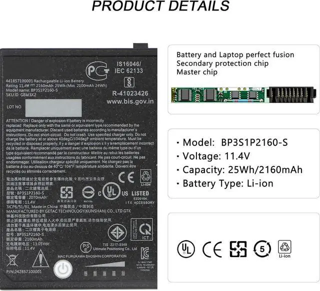 SpecificationsBattery Type: Li-ion; Voltage: 11.4V; Capacity: 25wh/2160mAh; Battery life: Up to 500 recharge cycles over the life of the battery.