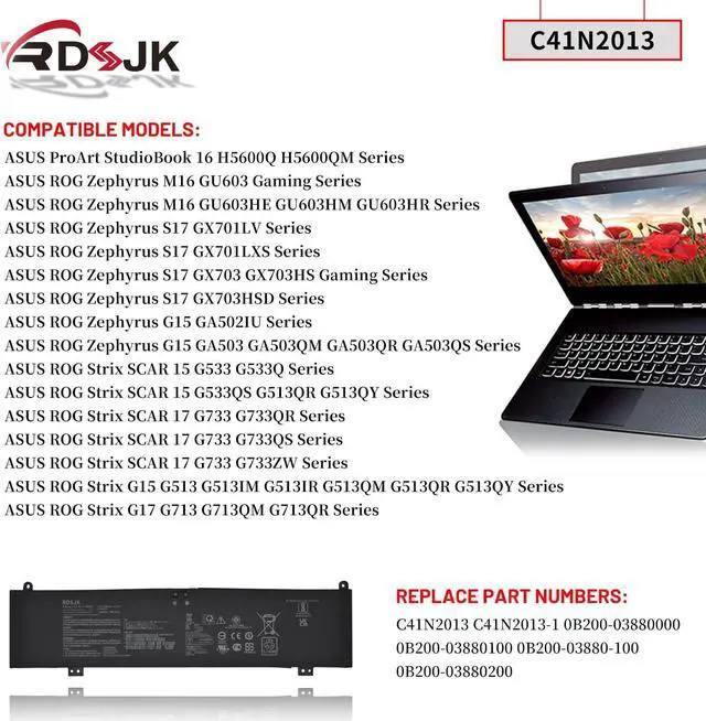 Compatible Models: Fit for ASUS ROG Zephyrus M16 GU603 Gaming Series, Fit for ASUS ROG Zephyrus S17 GX703 GX703HS Gaming Series, Fit for ASUS ROG Zephyrus G15 GA503 GA503QM Series, Fit for ASUS ROG Strix SCAR 15 G533 G533QS Series, Fit for ASUS ROG Strix SCAR 17 G733 Series, Fit for ASUS ROG Strix G15 G513 G513QR G513QY Series, Fit for ASUS ROG Strix G17 G713 Series, Fit for ASUS ROG Zephyrus S17 GX703HSD Series, Fit for ASUS ROG Zephyrus G15 GA502IU GA503Q GA503QR GA503QS Series